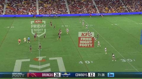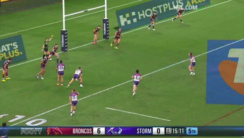 The Broncos don’t have that sort of threat from dummy half, but Patrick Carrigan offers something different one pass wider. He’s an elite ball carrier first and foremost which is a key aspect of an great ball-playing middle. That dual threat allows the Broncos to move the ball wide early and often to capitalise on any cues the Storm line presents.