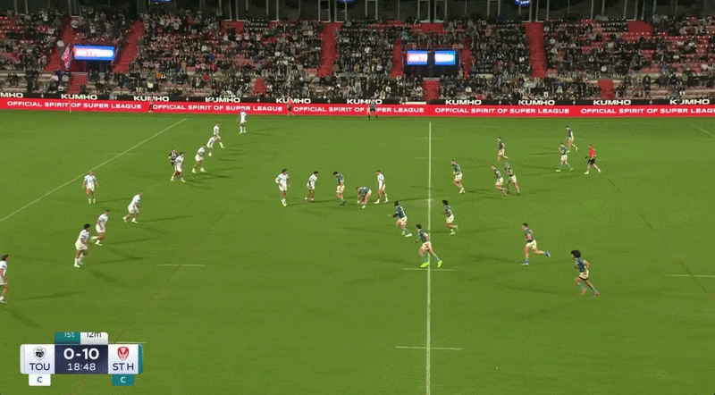 First, it looks as though Connor Tracey is already in position to target the shortside to make it 4 v 4 on the edge. When Matt Burton makes his late move from the longside to the shortside, the second marker is forced into action. He follows Burton down the shortside as the first marker takes care of Bailey Hayward at dummy half.