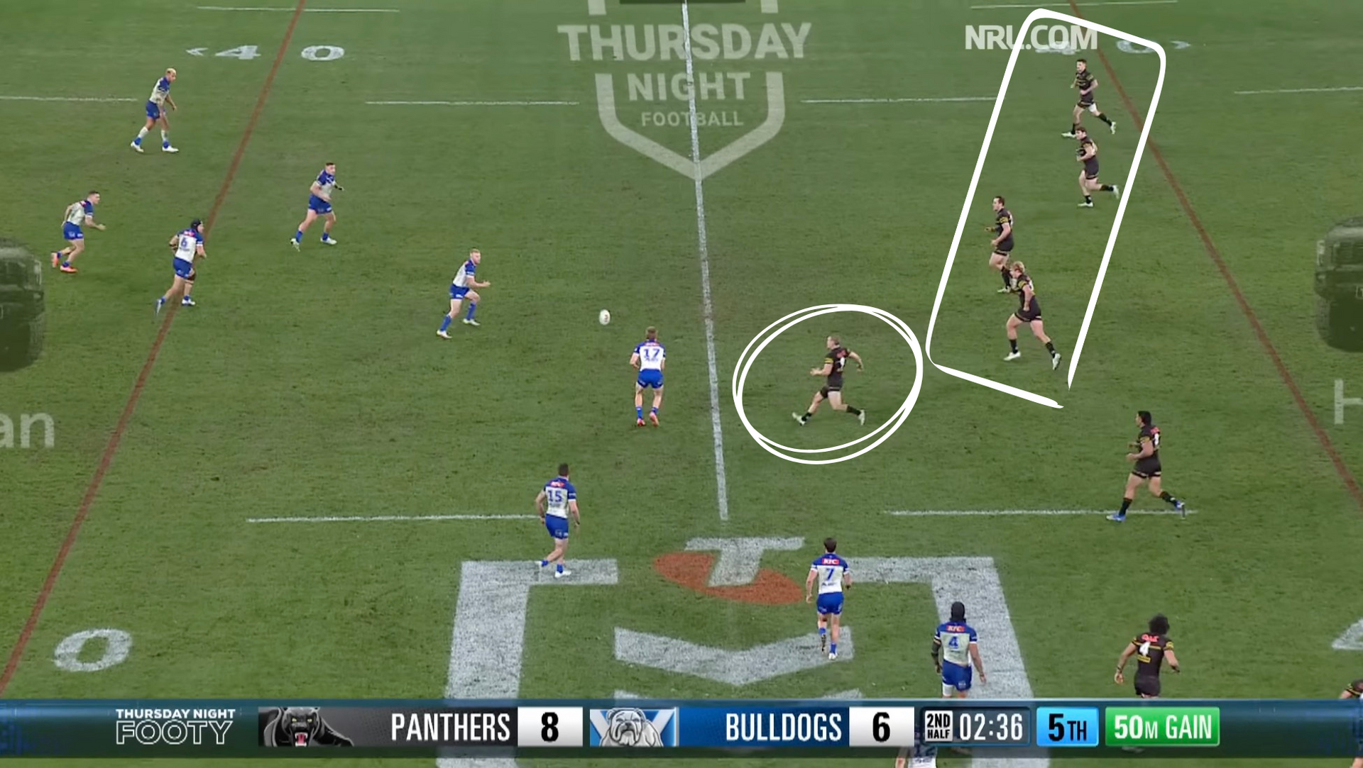 With the two markers split, Tracey straightens up and hits the hole in behind the ruck, flying into the backfield before the Bulldogs use the momentum to score under the posts.