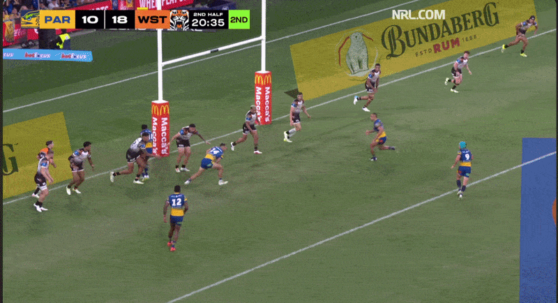 Momentum Tracker: We don’t need the Fox tracker on the screen to know when this game changed in the first half. Sean Russell leaving the field isn’t why, but it’s the point things changed for the Wests Tigers. One try became two as six agains and a blessed no-call on a Pierce-Paul strip coincided with repeated Eels errors out of yardage. Jack Williams streaking down the sideline before controversialy losing the ball2 against the run of play further added to the pointlessness of the tracker as anything other than a sponsorship opportunity.